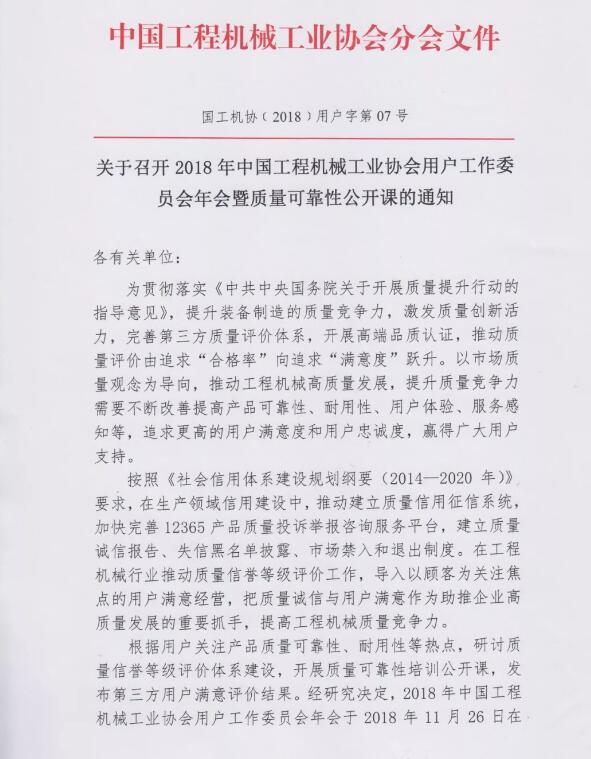 中國工程機械工業(yè)協(xié)會用戶工作委員會關于召開2018年年會暨質量可靠性公開課的通知