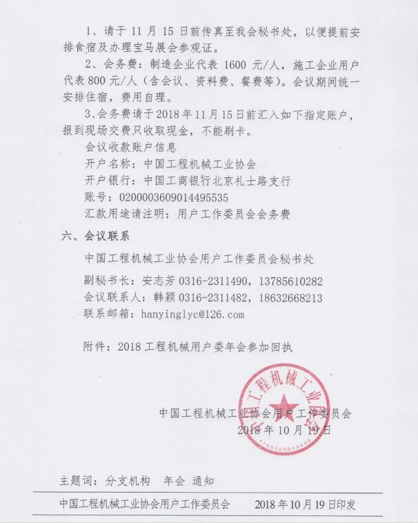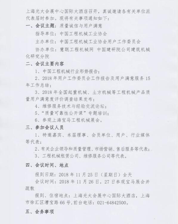 ? ?根據(jù)用戶關注產品質量可靠性、耐用性等熱點,研討質量信譽等級評價體系建設,開展質量可靠性培訓公開課,發(fā)布第三方用戶滿意評價結果。經研究決定,2018年中國工程機械工業(yè)協(xié)會用戶工作委員會年會于2018年11月26日在上海光大會展中心國際大酒店召開,真誠邀請各有關單位派代表屆時參加。現(xiàn)將有關事項通知如下: