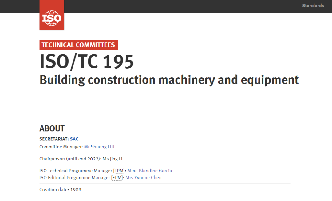 經(jīng)國(guó)際標(biāo)準(zhǔn)化組織(ISO)TMB同意,自2020年5月1日起,ISO/TC195國(guó)際標(biāo)準(zhǔn)化組織建筑施工機(jī)械與設(shè)備技術(shù)委員秘書處由中國(guó)(SAC)獨(dú)立承擔(dān),秘書處承擔(dān)單位為北京建筑機(jī)械化研究院有限公司,北京建筑機(jī)械化研究院有限公司劉雙任ISO/TC195委員會(huì)經(jīng)理(原稱為秘書),李靜任ISO/TC195主席(2020年-2022年)。